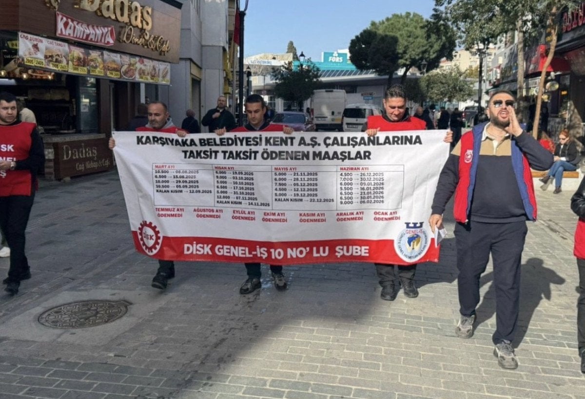 DİSK/Genel-İş İzmir 10 Nolu Şube çatısı altında örgütlü olan Karşıyaka Belediyesi Kent A.Ş. işçileri, yaşadıkları mali krizi ve mağduriyeti kamuoyuna duyurmak amacıyla Karşıyaka Çarşı girişinde bir araya geldi.