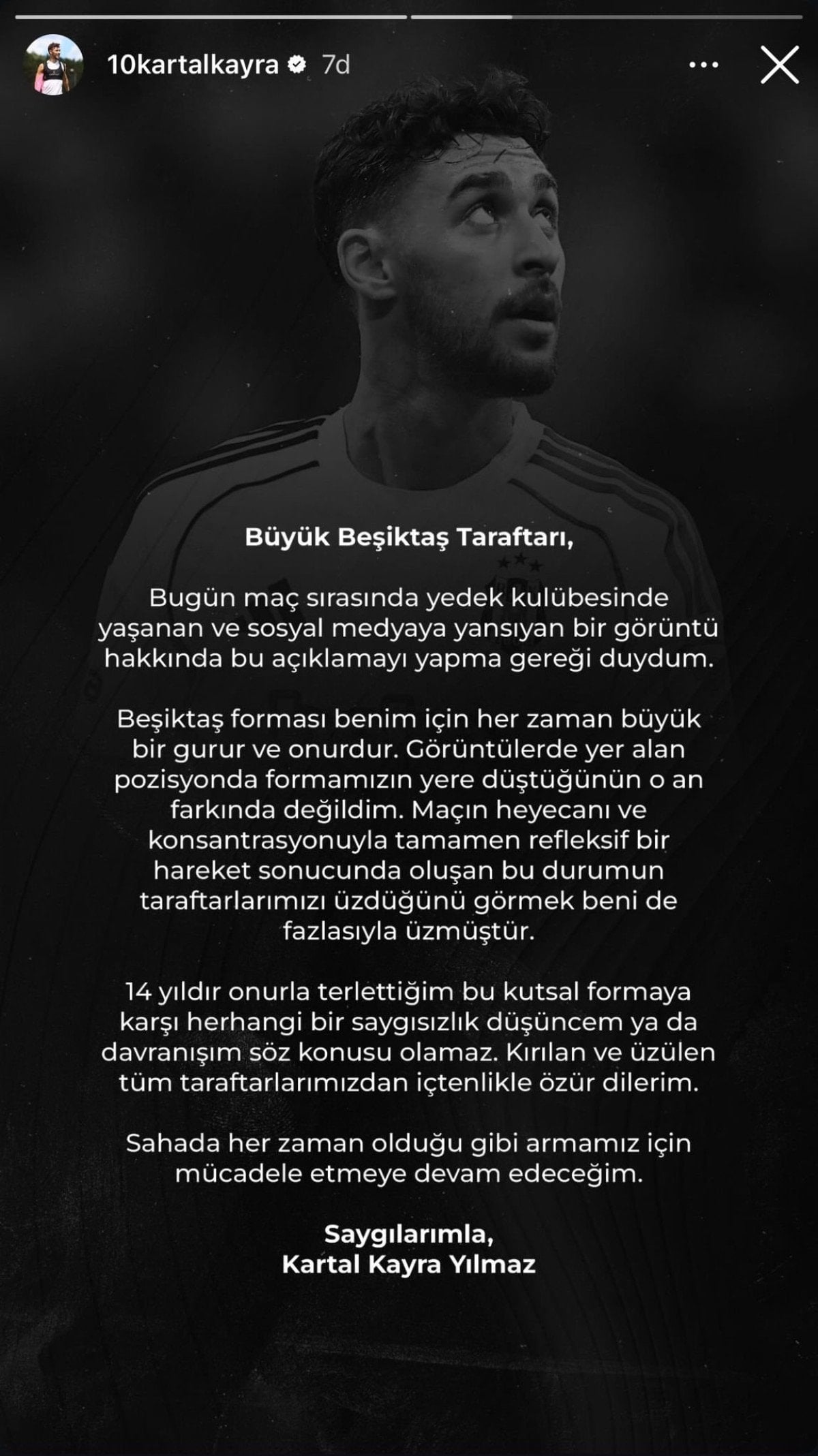 “Bugün maç sırasında yedek kulübesinde yaşanan ve sosyal medyaya yansıyan bir görüntü hakkında bu açıklamayı yapma gereği duydum. Beşiktaş forması benim için her zaman büyük bir gurur ve onurdur. Görüntülerde yer alan pozisyonda formamızın yere düştüğünün o an farkında değildim. Maçın heyecanı ve konsantrasyonuyla tamamen refleksif bir hareket sonucunda oluşan bu durumun taraftarlarımızı üzdüğünü görmek beni de fazlasıyla üzmüştür. 14 yıldır onurla terlettiğim bu kutsal formaya karşı herhangi bir saygısızlık düşüncem ya da davranışım söz konusu olamaz. Kırılan ve üzülen tüm taraftarlarımızdan içtenlikle özür dilerim. Sahada her zaman olduğu gibi armamız için mücadele etmeye devam edeceğim. Saygılarımla”