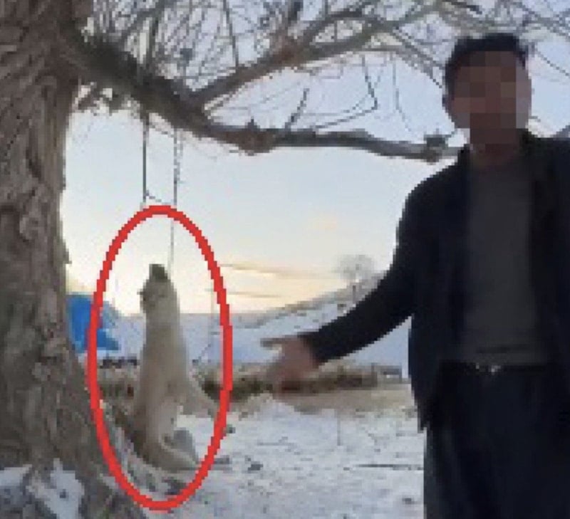 Köpeği asılı halde gören bir kişi, cep telefonuyla kayda almaya başladı.