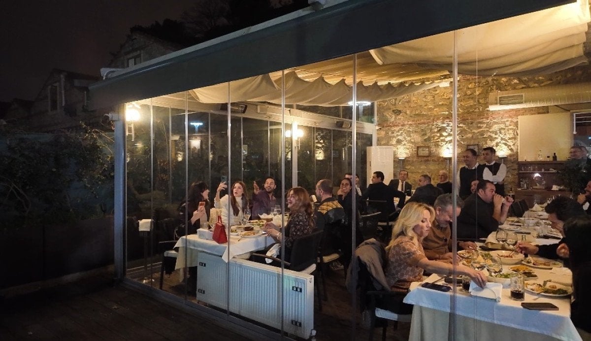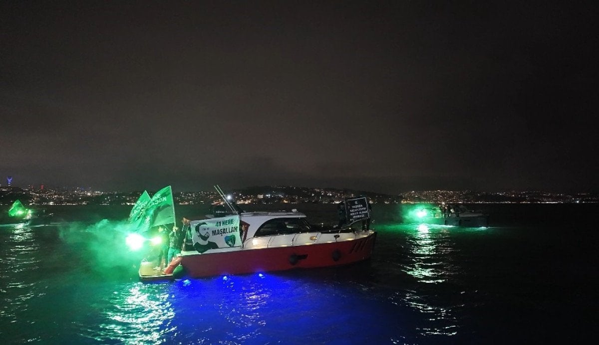 Yaklaşık 30 kişilik taraftar grubu denizden teknelerle restorana yaklaştı ve meşaleler eşliğinde sloganlar attı.