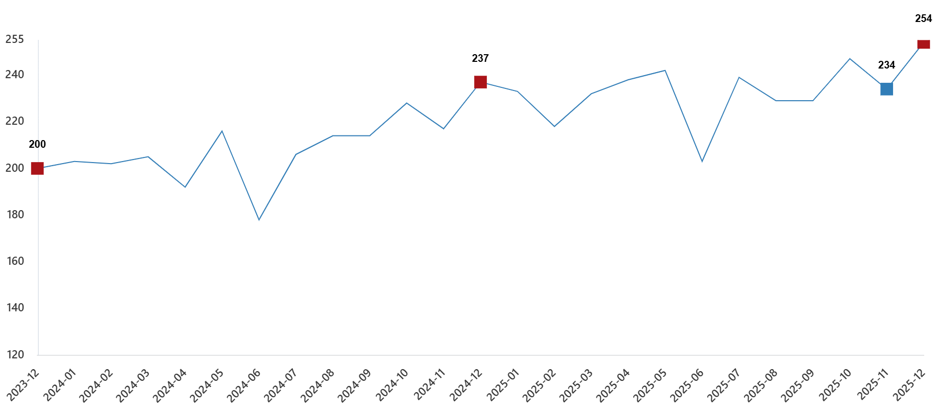 Bir önceki ay 233 bin 887 ton olan tavuk eti üretimi Aralık ayında %8,6 oranında artarak 253 bin 993 ton oldu.