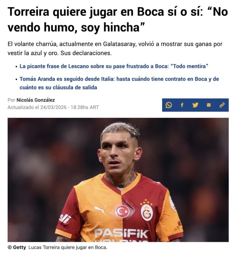 Boca Juniors’ta oynama arzusunu dile getiren 30 yaşındaki Lucas Torreira, “Sadece laf olsun diye konuşmuyorum. Galatasaray’ın önemli bir oyuncusu olarak, Boca’ya gelmek istediğimi söylediğimde nasıl bir tepki alacağımı düşünüyorsunuz? Boca’da oynamak istediğimi söylüyorum ve bu sözümün arkasındayım. Ben bir taraftarım ve en büyük idolüm Tevez.” ifadelerini kullandı.