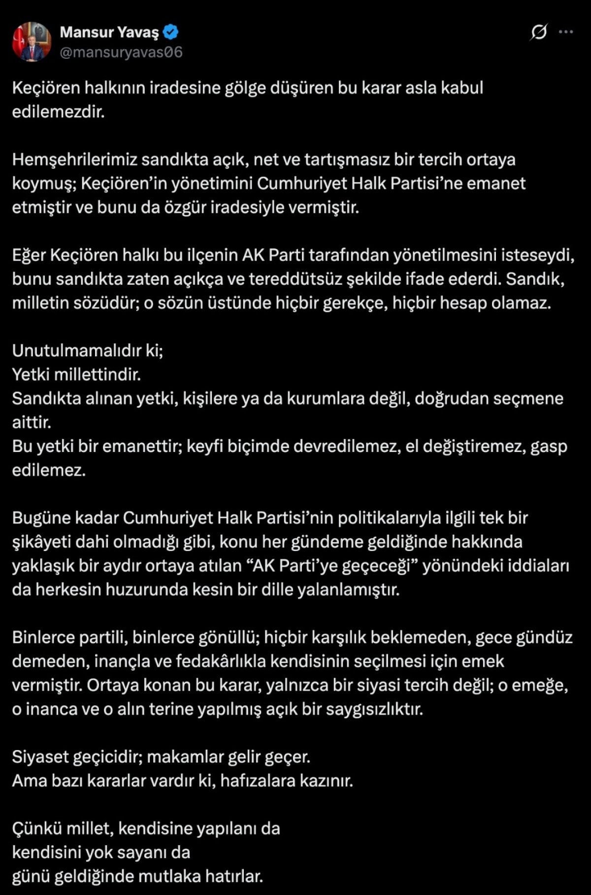 Eğer Keçiören halkı bu ilçenin AK Parti tarafından yönetilmesini isteseydi, bunu sandıkta zaten açıkça ve tereddütsüz şekilde ifade ederdi. Sandık, milletin sözüdür; o sözün üstünde hiçbir gerekçe, hiçbir hesap olamaz.