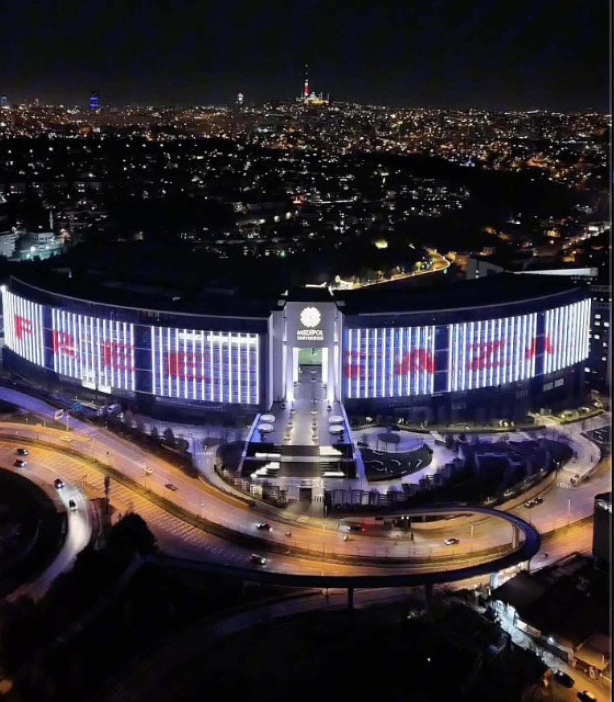 Üniversite binasına yansıtılan Türk ve Filistin bayrakları ile ‘Free Gaza (Özgür Gazze)’ yazısıyla bu soykırıma dikkat çekildi.