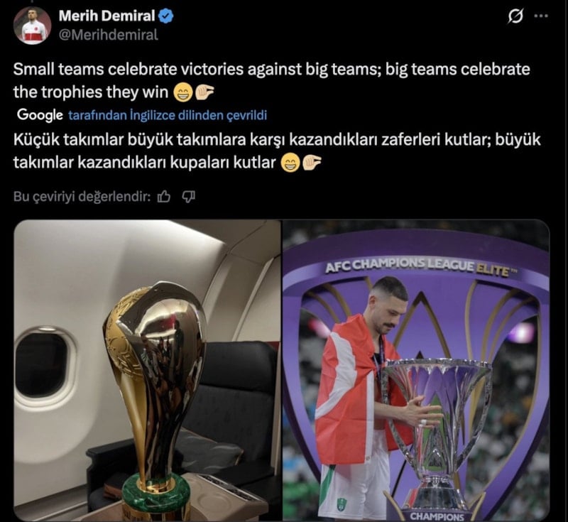 Paylaşıma aynı şekilde gönderme yaparak yanıt veren Merih, “Küçük takımlar büyük takımlara karşı kazandıkları zaferleri kutlar; büyük takımlar da kazandıkları kupaları kutlar.”ifadelerini kullandı.