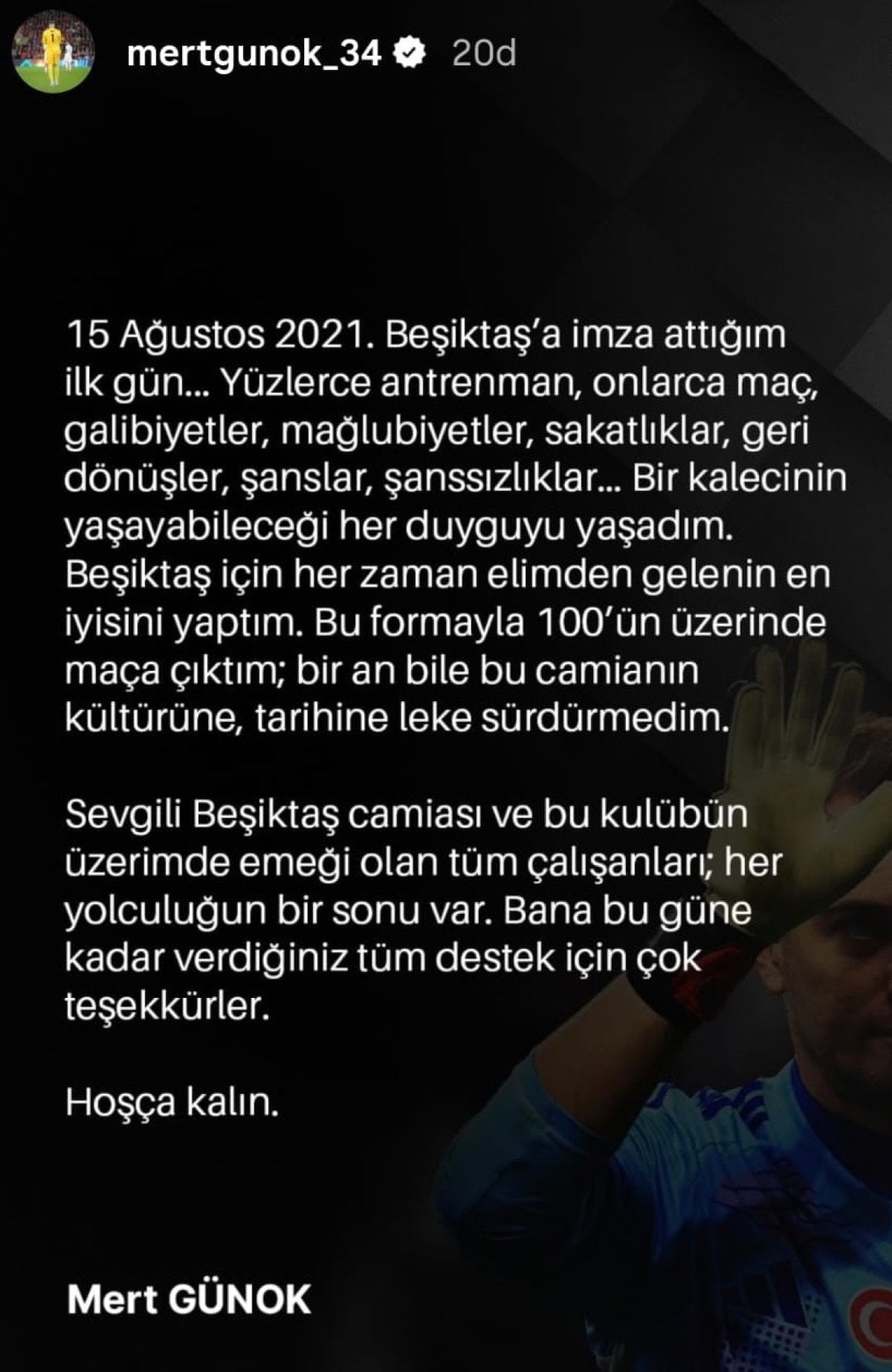 Geçtiğimiz günlerde Beşiktaş ile karşılıklı anlaşarak sözleşmesini fesheden Mert Günok, veda paylaşımı yaptı.