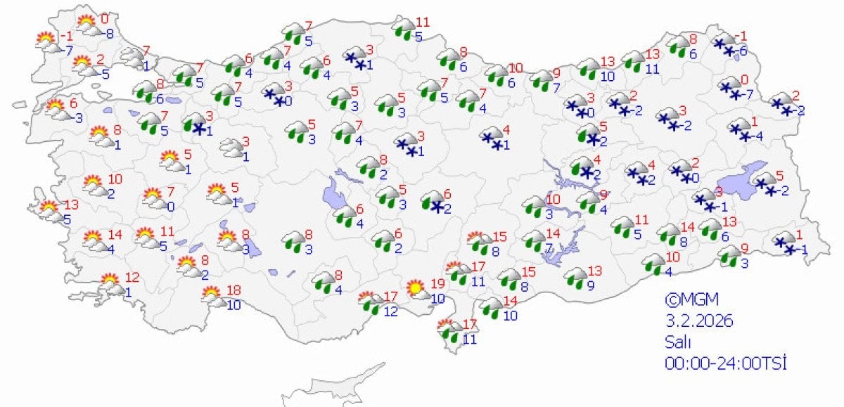 Salı günü kar yağışının doğu bölgelerde yoğunlaşması, batı ve güney kesimlerde parçalı bulutlu ve daha az yağışlı bir havanın hakim olması bekleniyor.