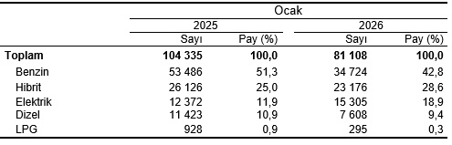 Trafiğe kaydı yapılan otomobillerin yakıt cinslerine göre dağılımı, Ocak 2026