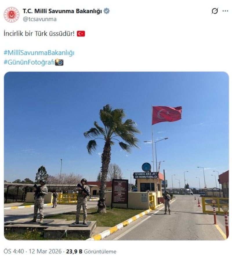 Paylaşımda, “İncirlik bir Türk üssüdür” ifadelerine yer verildi. MSB’nin bu paylaşımı, hem askerlerin görevine duyulan saygıyı hem de İncirlik Üssü’nün Türkiye’ye ait olduğunu vurgulayan anlamlı bir mesaj olarak öne çıktı.