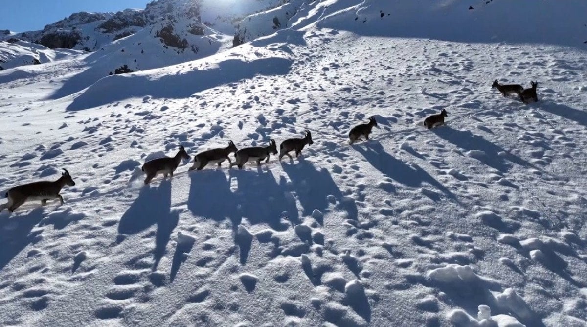 Koruma altındaki yaban keçilerinin karlı zirvelerdeki bu yolculuğu, doğanın eşsiz manzaralarını bir kez daha gözler önüne serdi.