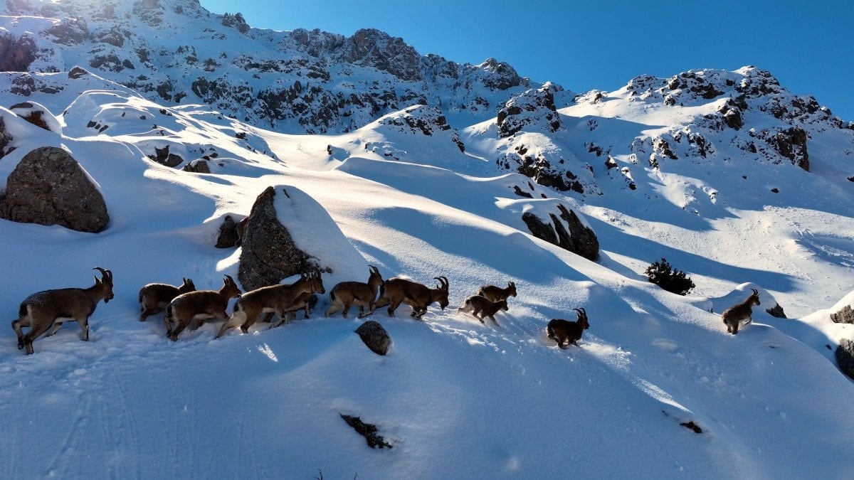Doğa Koruma Birliğinin (IUCN) yayımladığı Nesli Tükenme Tehlikesi Altında Olan Türlerin Kırmızı Listesi’nde yer alan yaban keçileri, karlı dağları aşarken belgesel tadında görüntüler oluşturdu.