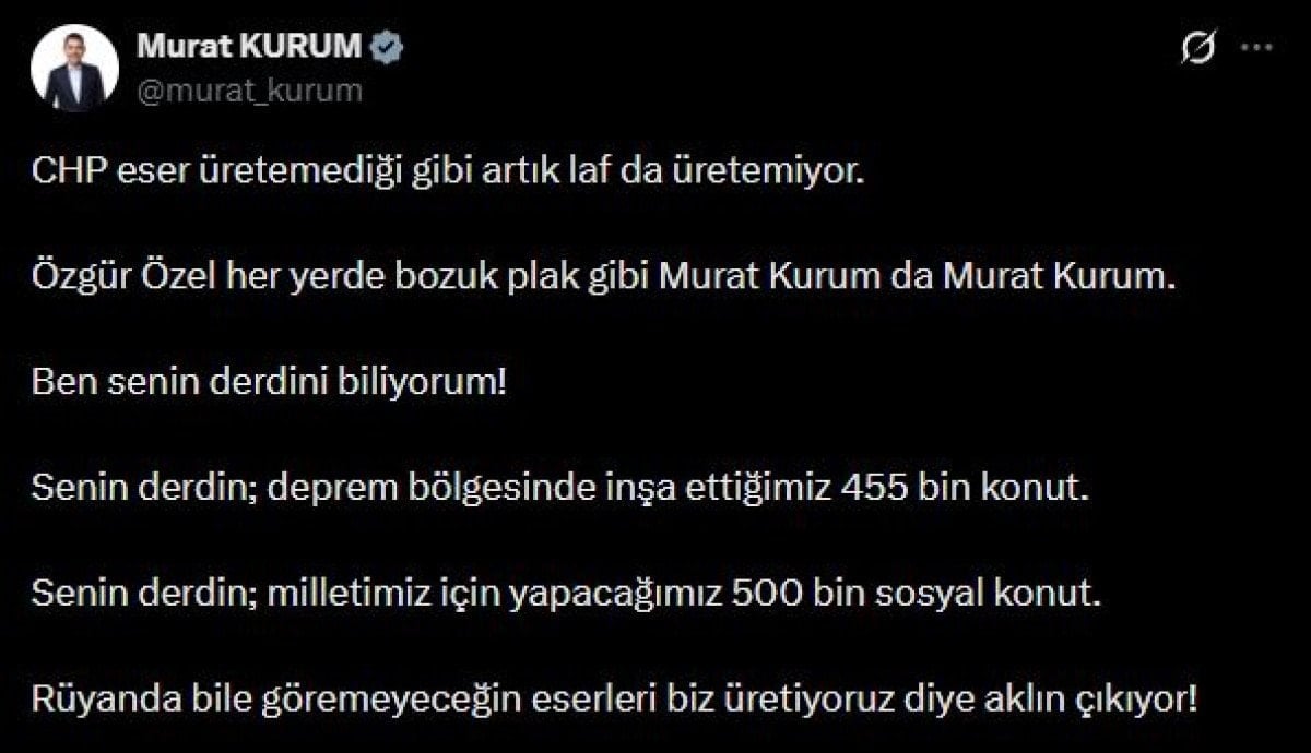 Kurum paylaşımında, “CHP eser üretemediği gibi artık laf da üretemiyor. Özgür Özel her yerde bozuk plak gibi Murat Kurum da Murat Kurum. Ben senin derdini biliyorum! Senin derdin; deprem bölgesinde inşa ettiğimiz 455 bin konut. Senin derdin; milletimiz için yapacağımız 500 bin sosyal konut. Rüyanda bile göremeyeceğin eserleri biz üretiyoruz diye aklın çıkıyor” ifadelerini kullandı.