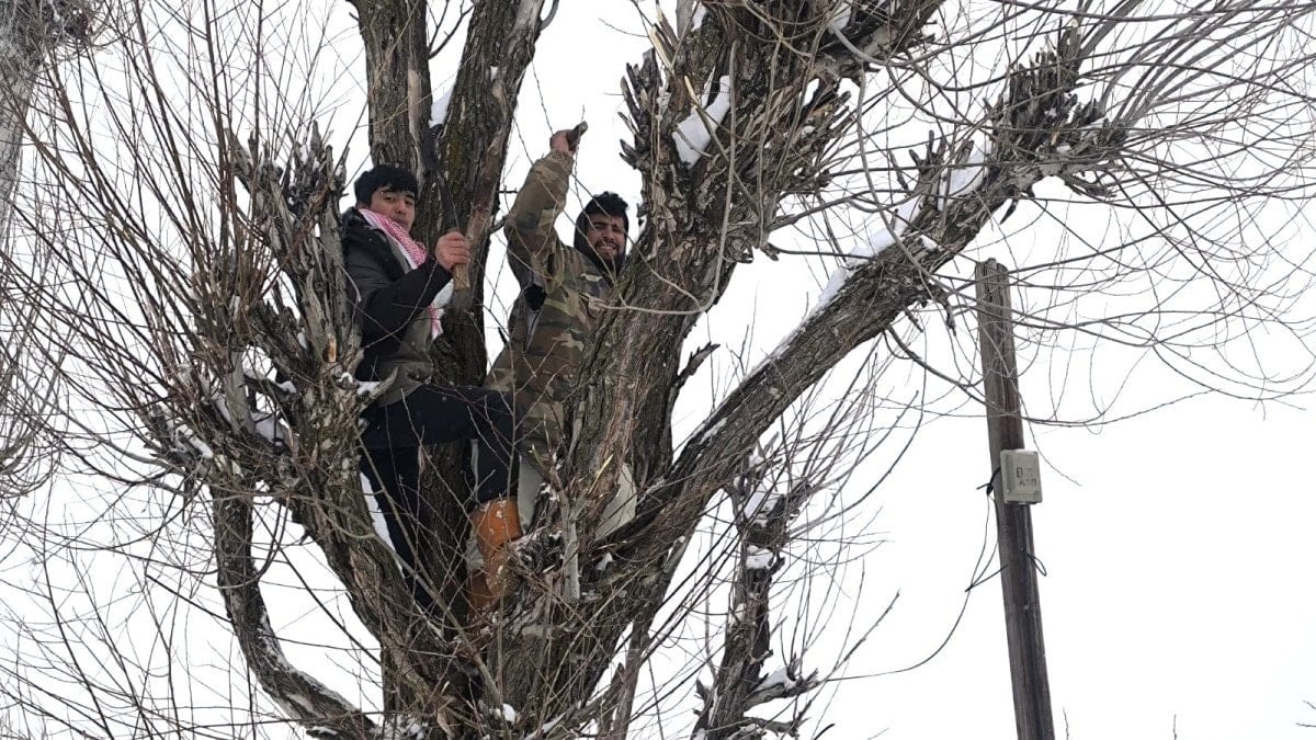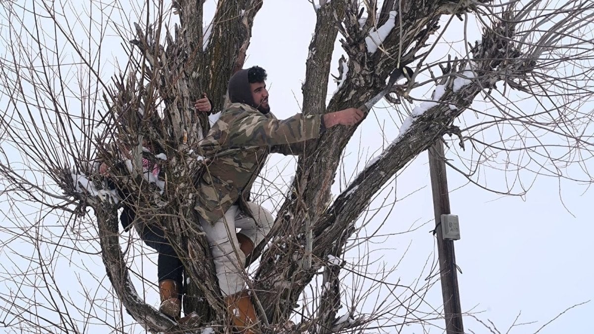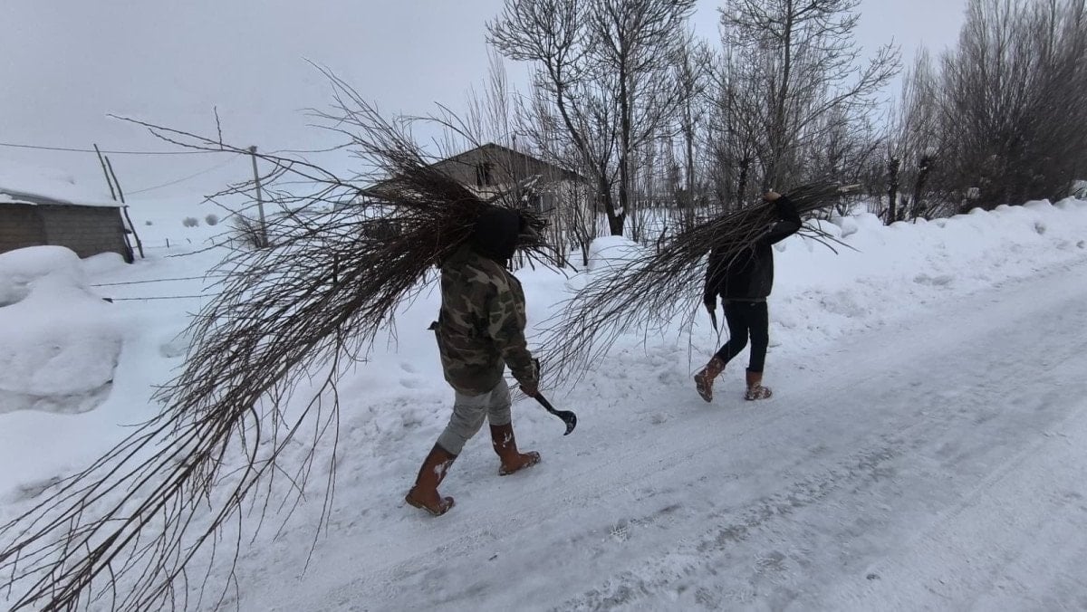 Kar üzerinde hayvanlarını beslemekte zorlanan üreticiler, kendi bahçelerindeki söğüt ağaçlarını budayarak küçükbaş hayvanlarına veriyor.