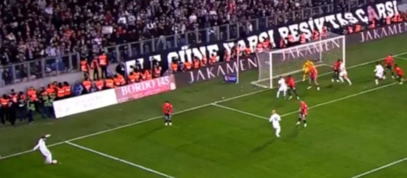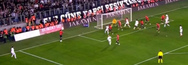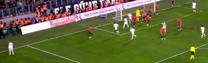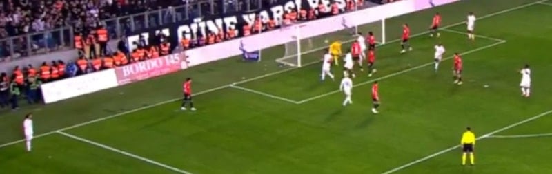 Beşiktaş’ın sol kanattan, ceza alanı yan çizgisinin hemen gerisinden ve son çizgiye çok yakın bir noktadan kazandığı frikikte Orkun Kökçü sağ ayağının içiyle uzak köşeye sert ve düzgün vurdu, kalecinin müdahale edemediği top, uzak direğin içine çarpıp ağlarla buluştu.