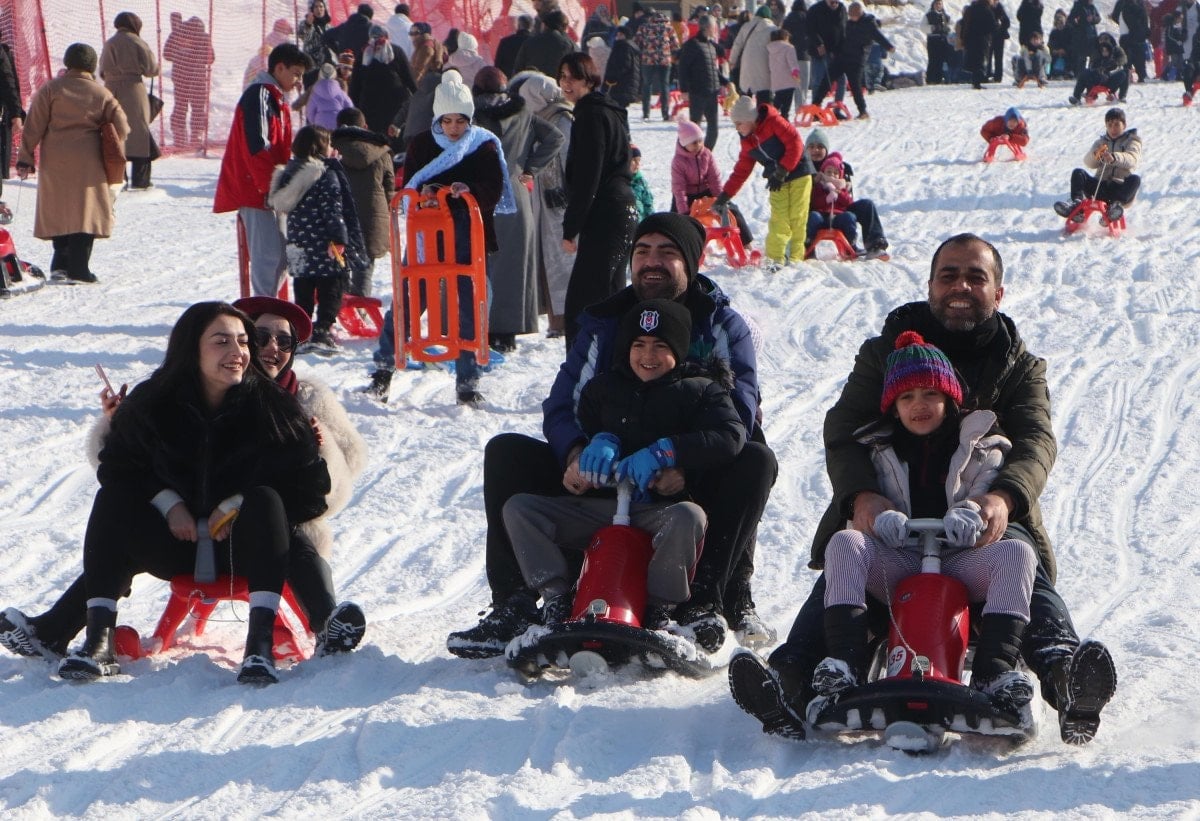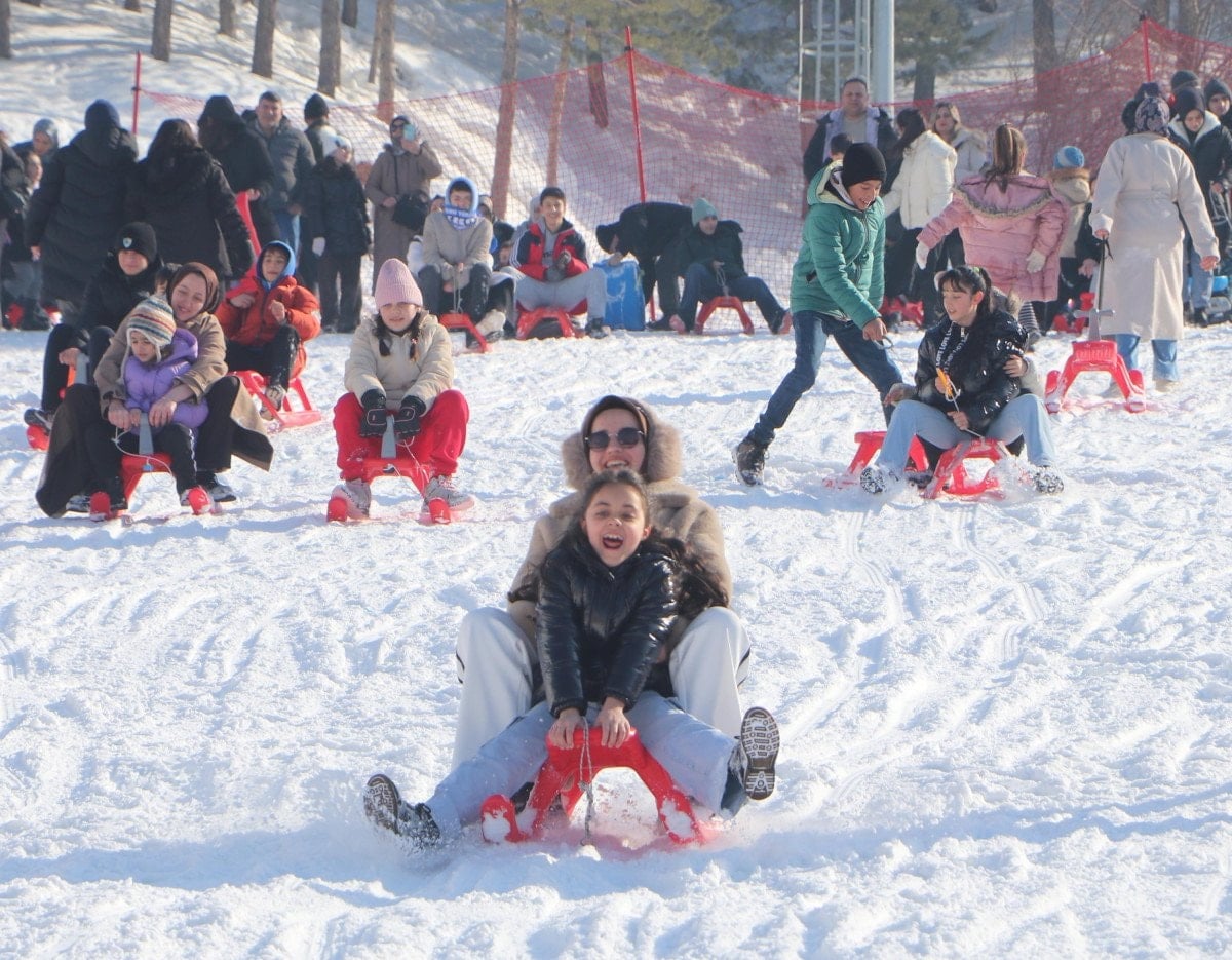 Karnelerini aldıktan sonra aileleriyle birlikte tatil için denizden 3 bin 176 metre yükseklikteki Palandöken Kayak Merkezi’ne gelen çocukların bazıları kayak öğrenirken, bazıları da kızaklarla pistte kaymanın keyfini yaşıyor.