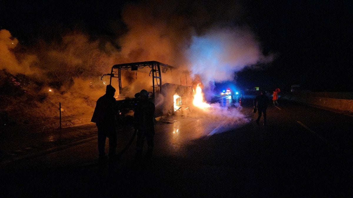 Otobüs kaptanı, dumanı fark etmesinin ardından aracı emniyet şeridine çekerek yolcuları hızla tahliye etti. Kısa sürede büyüyen yangın, otobüsün tamamını sardı. Alevler, yol kenarındaki çalılık alana da sıçradı.