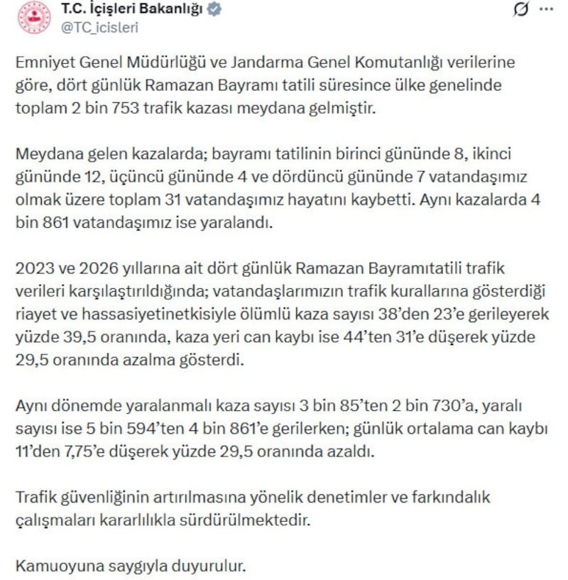 2023 ve 2026 yıllarına ait dört günlük Ramazan Bayramı tatili trafik verilerinin karşılaştırıldığı açıklamada, “Vatandaşlarımızın trafik kurallarına gösterdiği riayet ve hassasiyetin etkisiyle ölümlü kaza sayısı 38’den 23’e gerileyerek yüzde 39,5 oranında, kaza yeri can kaybı ise 44’ten 31’e düşerek yüzde 29,5 oranında azalma gösterdi. Aynı dönemde yaralanmalı kaza sayısı 3 bin 85’ten 2 bin 730’a, yaralı sayısı ise 5 bin 594’ten 4 bin 861’e gerilerken; günlük ortalama can kaybı 11’den 7,75’e düşerek yüzde 29,5 oranında azaldı. Trafik güvenliğinin artırılmasına yönelik denetimler ve farkındalık çalışmaları kararlılıkla sürdürülmektedir” ifadelerine yer verildi.