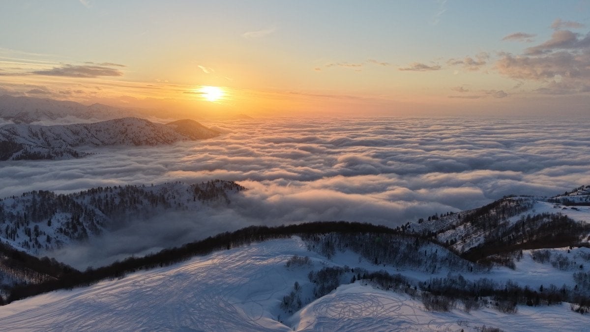 Kar kalınlığının 2 metreyi aştığı Handüzü Yaylası’nda hava sıcaklığının yükselmesiyle vadilerde oluşan bulut, seyrine doyumsuz bir manzara sunuyor.
