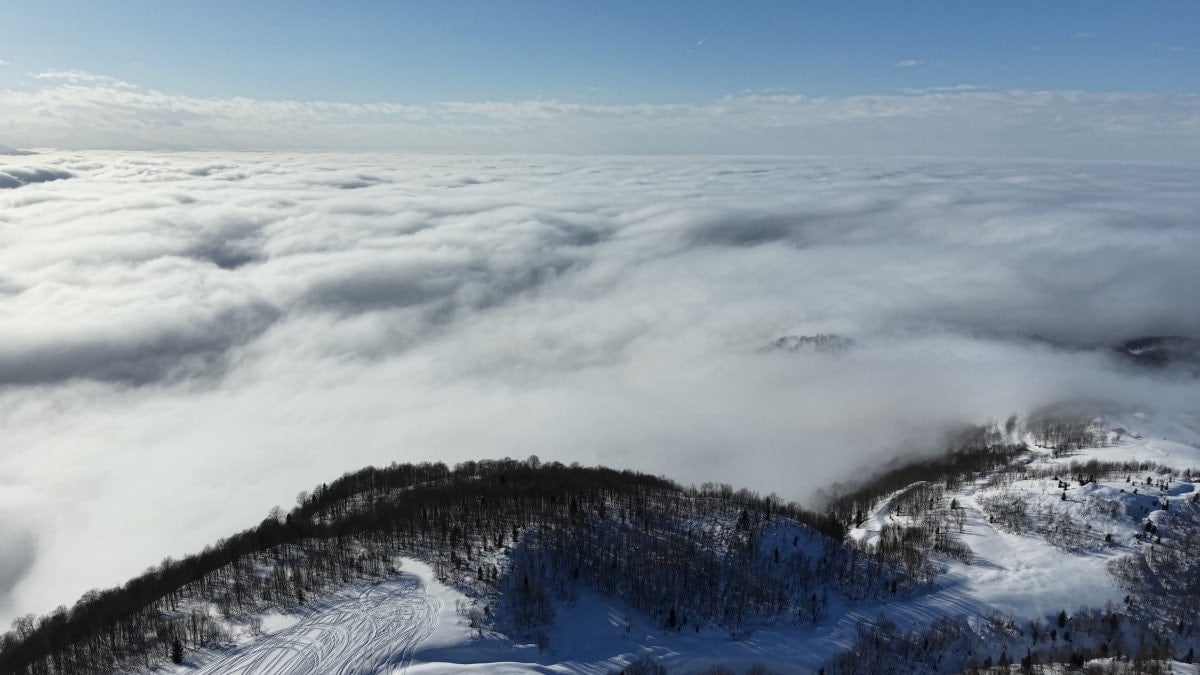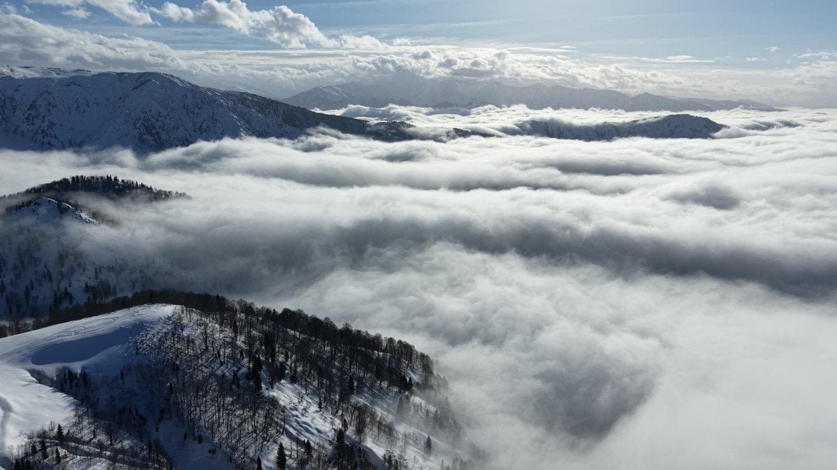 Ziyaretçilere görsel şölen sunan bulutların karlı kaplı doğayla görüntüsü, drone ile görüntülendi.