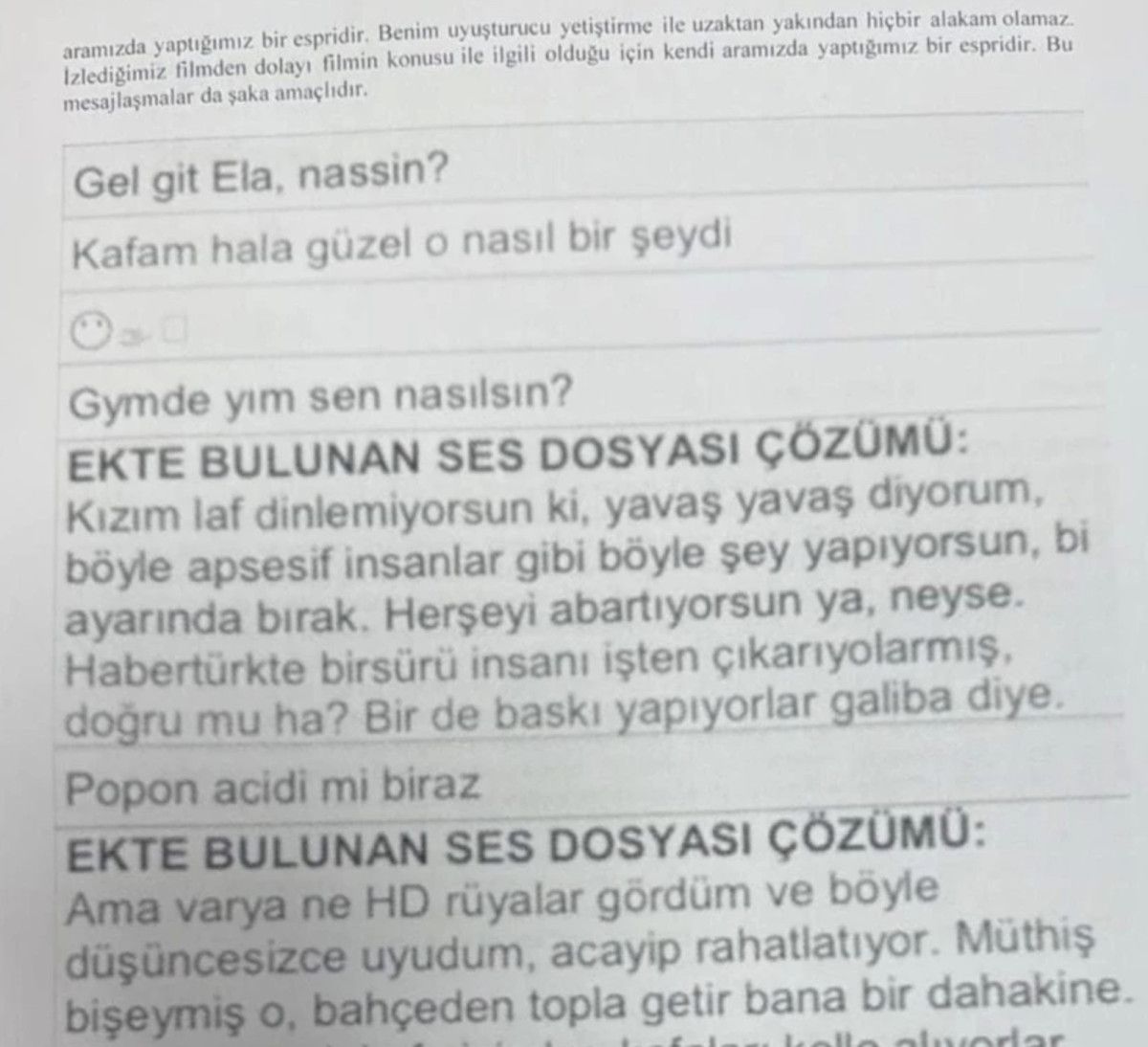 İncelenen dijital materyallerden ele geçiren ses kayıtları da ifadede yer aldı. Saran’ın Cebeci’ye “Kızım laf dinlemiyorsun ki, yavaş yavaş diyorum. Böyle agresif insanlar gibi böyle şeyler yapıyorsun. Ayarında bırak, her şeyi abartıyordu. Neyse Habertürk’te bir sürü insan çıkarıyormuş. Doğru mu?” dediği görüldü.