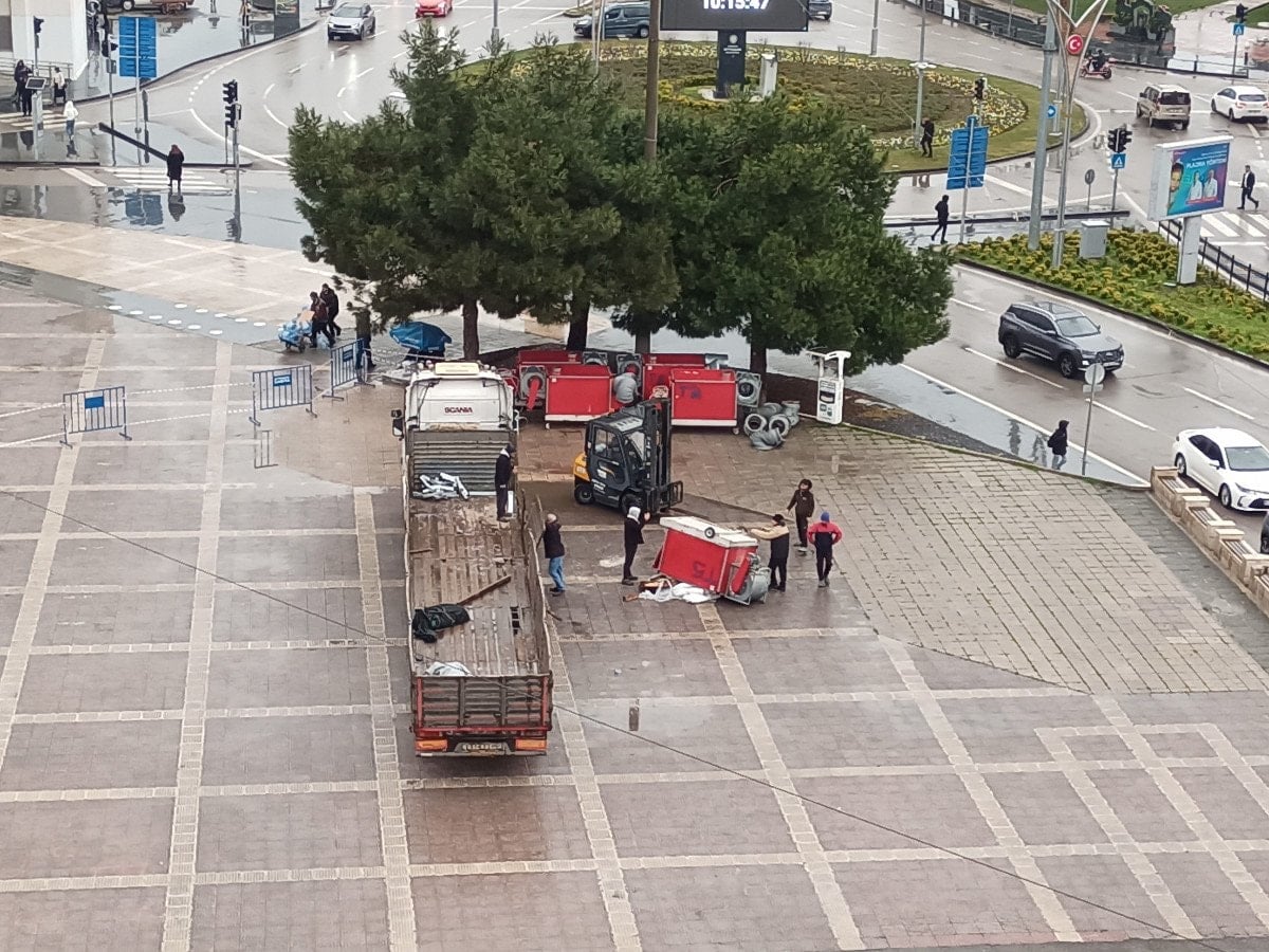 Samsun’un en yoğun noktalarından biri olan Cumhuriyet Meydanı’nda yapılan yük indirme çalışmaları sırasında meydana geldi. Ramazan çadırında kullanılmak üzere tırla alana getirilen havalandırma üniteleri için zabıta ekipleri tarafından geniş güvenlik önlemleri alındı ve meydan bariyerlerle çevrildi.