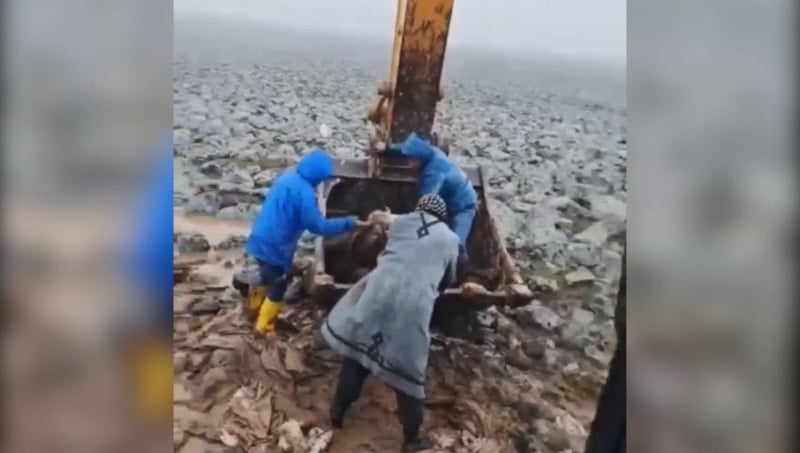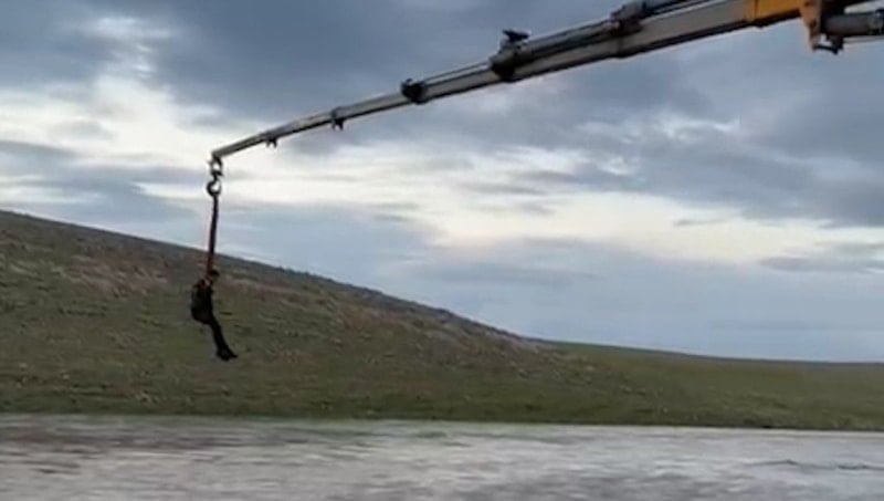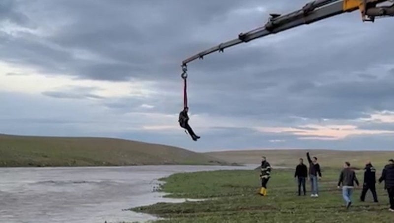 Akıntının şiddetli olması nedeniyle kurtarma çalışmalarına vinç ve iş makineleri de dahil edildi. Vincin ucundaki kancaya bağlanan halata tutunan Mazlum A., suya kapılmamak için büyük çaba gösterdi.