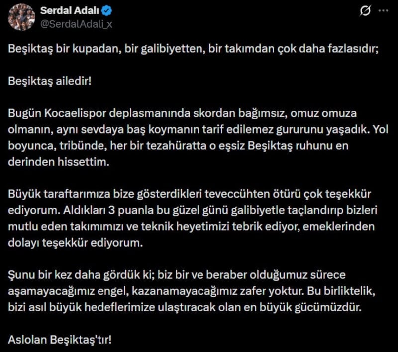 Beşiktaş Kulübü Başkanı Serdal Adalı, taraftarlarla birlikte deplasmanda tribününde izlediği ve kazandıkları Kocaelispor maçının ardından sosyal medya hesabından paylaşım yaptı.