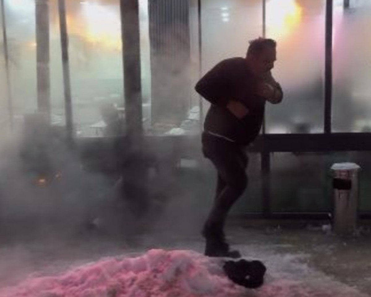 İş yerinin önünde sıcak su şovu yapmak isteyen Raşit Yıldırım, suyu havaya dökerek donmasını görüntülemek istedi.