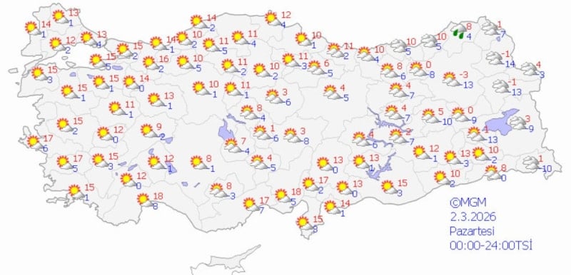 Minimum sıcaklıklar birçok noktada -5 ile -10 derece bandında ve bazı yüksek rakımlı yerlerde daha düşük değerler kaydediliyor.