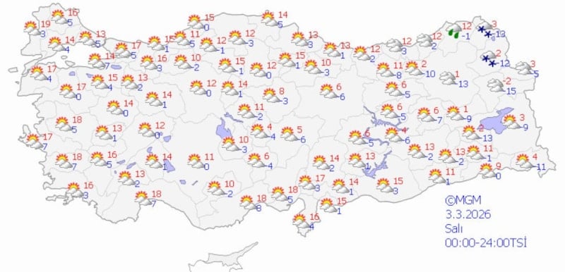 Minimum sıcaklıklar birçok noktada -5 ile -10 derece bandında ve bazı yüksek rakımlı yerlerde daha düşük değerler kaydediliyor.