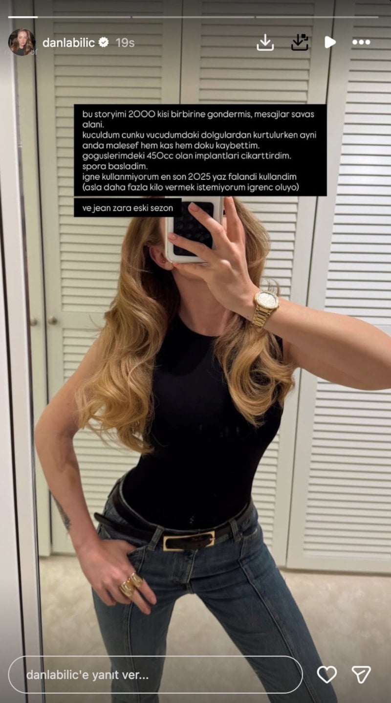 “Bu storymi 2000 kişi birbirine göndermiş, mesajlar savaş alanı. Küçüldüm çünkü vücudumdaki dolguları temizletirken maalesef aynı anda hem kas hem doku kaybettim. Göğüslerimdeki 450 cc’lik implantları çıkarttırdım. Spora başladım. Zayıflama iğnesi kullanmıyorum, en son 2025 yazında kullanmıştım. Zaten daha fazla kilo vermek de istemiyorum.”