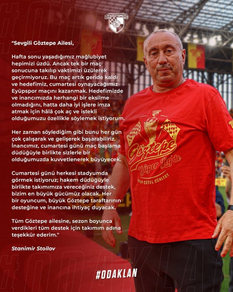 Stoilov, kulübün sosyal medya platformundan açıklamasında, “Sevgili Göztepe ailesi, hafta sonu yaşadığımız mağlubiyet hepimizi üzdü. Ancak tek bir maç sonucuna takılıp vaktimizi üzülerek geçirmiyoruz.” değerlendirmesinde bulundu.