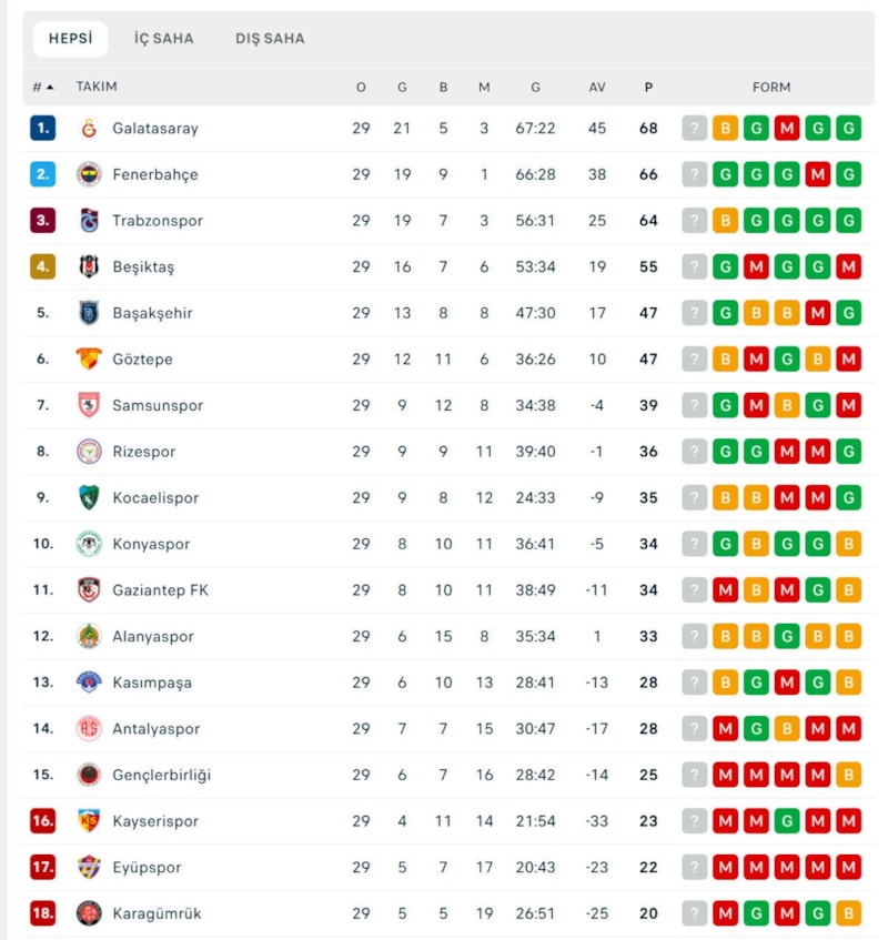 Zirve yarışında Galatasaray puanını 68’e yükseltirken, Fenerbahçe 66 puana çıktı. Trabzonspor ise 64 puanla haftayı 3. sırada tamamladı.