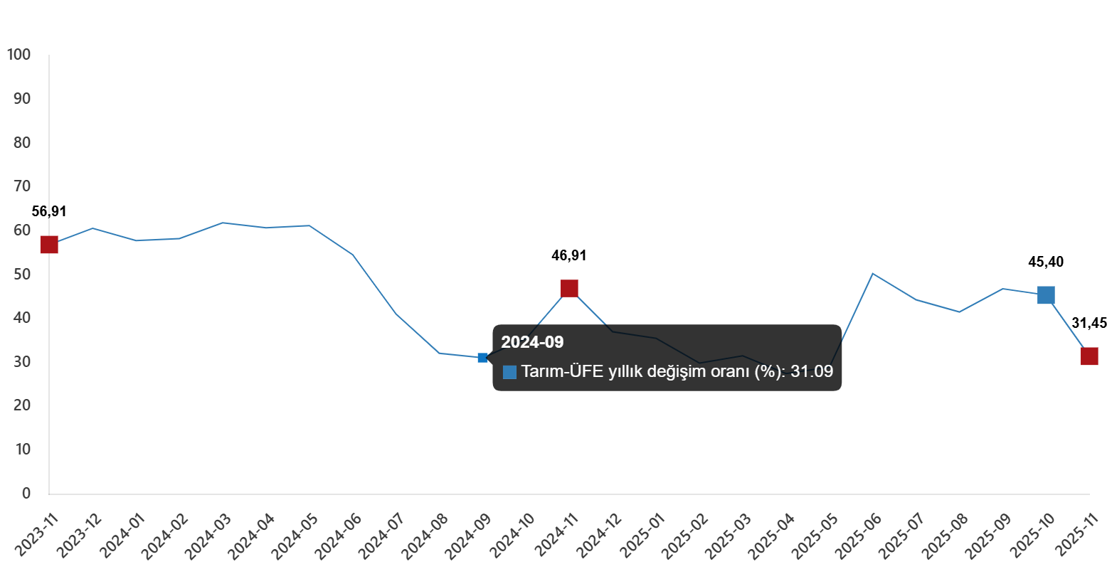 Tarım-ÜFE’de (2020=100), 2025 yılı Kasım ayında bir önceki aya göre %1,56 azalış, bir önceki yılın Aralık ayına göre %31,97 artış, bir önceki yılın aynı ayına göre %31,45 artış ve on iki aylık ortalamalara göre %37,58 artış gerçekleşti.