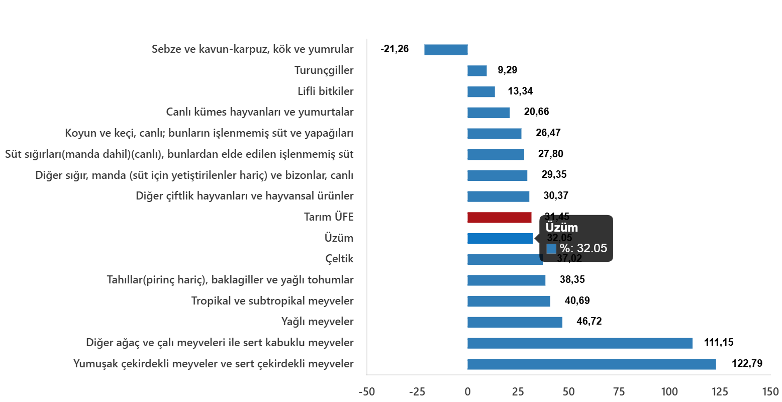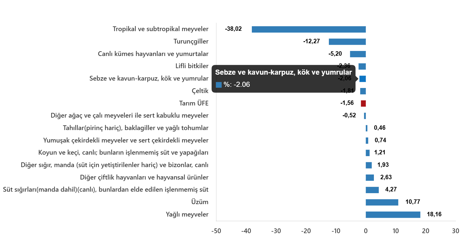 Sektörlerde bir önceki aya göre, tarım ve avcılık ürünleri ve ilgili hizmetlerde %1,75 azalış, ormancılık ürünleri ve ilgili hizmetlerde %1,66 artış ve balık ve diğer balıkçılık ürünleri; su ürünleri; balıkçılık için destekleyici hizmetlerde %1,07 artış gerçekleşti. Ana gruplarda bir önceki aya göre, tek yıllık (uzun ömürlü olmayan) bitkisel ürünlerde %0,69 azalış, çok yıllık (uzun ömürlü) bitkisel ürünlerde %0,03 azalış ve canlı hayvanlar ve hayvansal ürünlerde %2,17 artış gerçekleşti.
