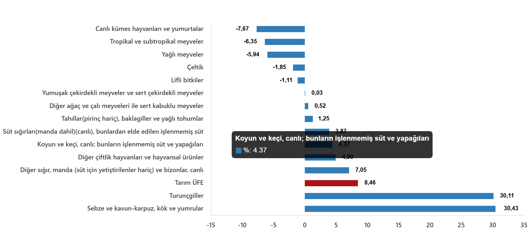 Sektörlerde bir önceki aya göre, tarım ve avcılık ürünleri ve ilgili hizmetlerde %8,42 artış, ormancılık ürünleri ve ilgili hizmetlerde %14,36 artış ve balık ve diğer balıkçılık ürünleri; su ürünleri; balıkçılık için destekleyici hizmetlerde %4,08 artış gerçekleşti. Ana gruplarda bir önceki aya göre, tek yıllık (uzun ömürlü olmayan) bitkisel ürünlerde %12,14 artış, çok yıllık (uzun ömürlü) bitkisel ürünlerde %7,00 artış ve canlı hayvanlar ve hayvansal ürünlerde %4,02 artış gerçekleşti.