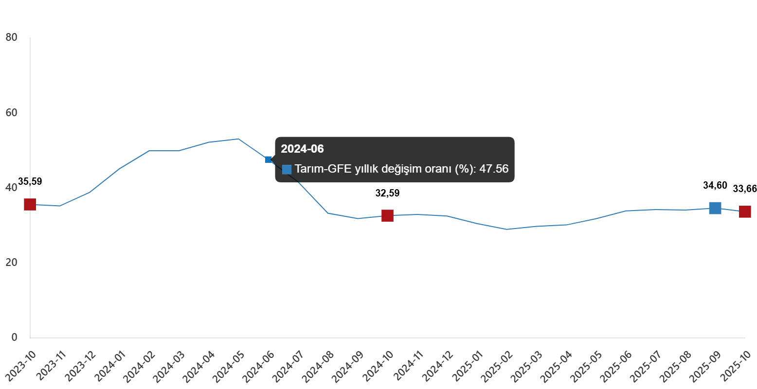 Tarım-GFE’de (2020=100), 2025 yılı Ekim ayında bir önceki aya göre %2,04 artış, bir önceki yılın Aralık ayına göre %29,06 artış, bir önceki yılın aynı ayına göre %33,66 artış ve on iki aylık ortalamalara göre %32,30 artış gerçekleşti.