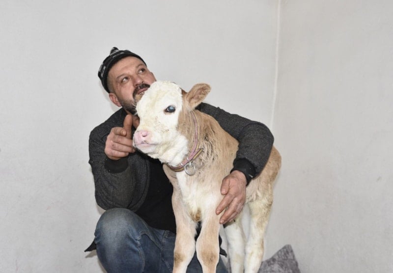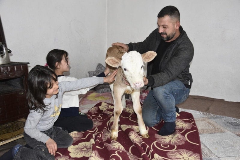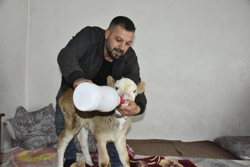 Buzağının sahibi Çetin Aygül ile kızı Nahide Nur Aygül, küçük hayvanla yakından ilgileniyor. Aile, buzağıyı biberonla süt içirerek beslerken, küçük Nahide Nur da minik hayvanın tüylerini tarayıp ayaklarına çorap giydirerek bakımına yardımcı oluyor.