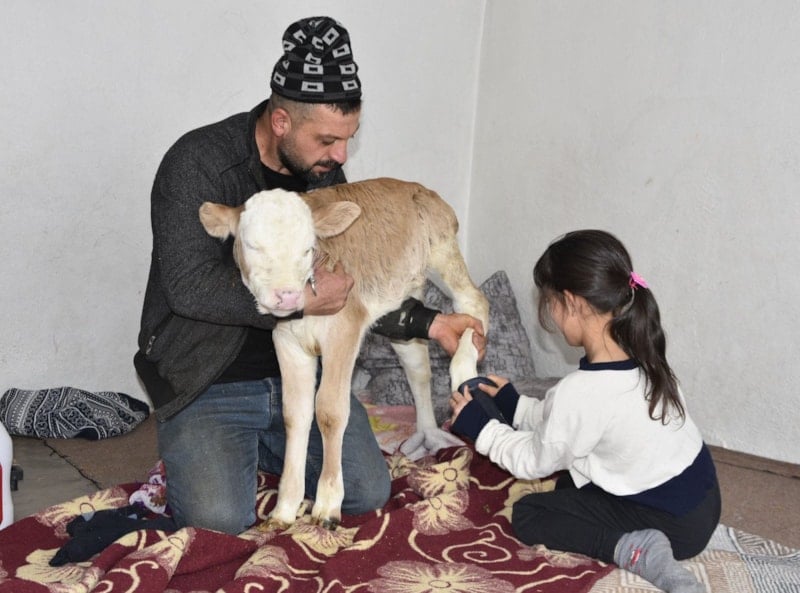 Buzağının sahibi Çetin Aygül ile kızı Nahide Nur Aygül, küçük hayvanla yakından ilgileniyor. Aile, buzağıyı biberonla süt içirerek beslerken, küçük Nahide Nur da minik hayvanın tüylerini tarayıp ayaklarına çorap giydirerek bakımına yardımcı oluyor.