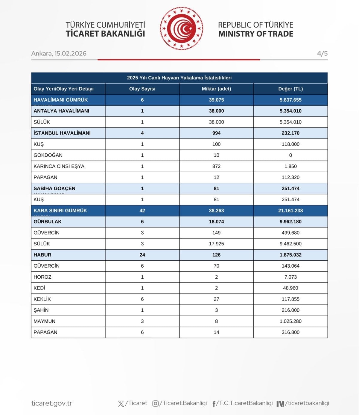 2025 yılı içerisinde kara sınır kapılarında 42 olayda 38 bin 263 adet, havalimanı gümrük sahalarında ise 6 olayda 39 bin 75 adet canlı hayvan yakalaması gerçekleştirildi.