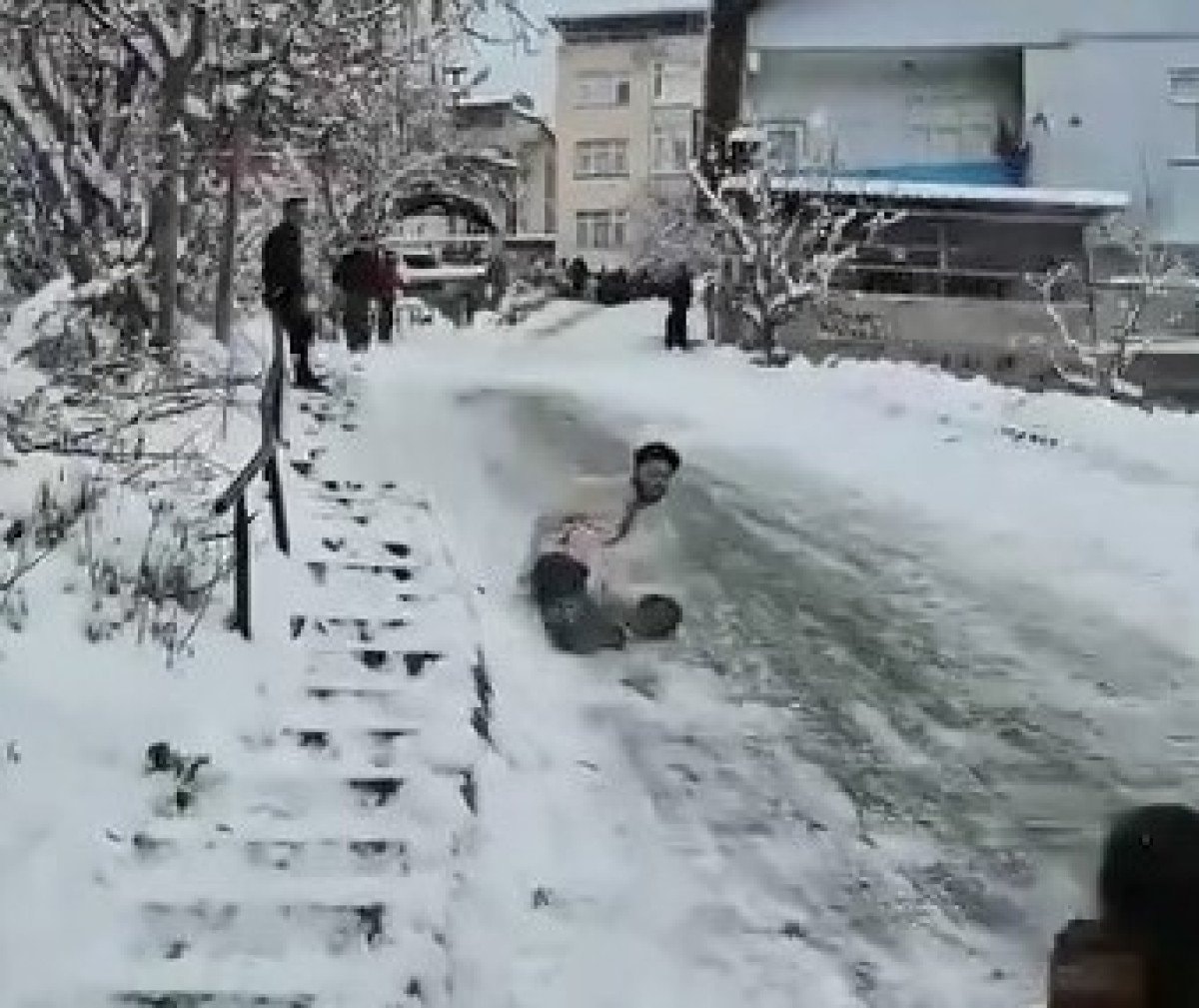 İlçede etkili olan kar yağışı sonrası kayganlaşan yolda poşetlerle kayan gençler, kontrolsüz şekilde hızlanarak büyük risk aldı. Yokuş aşağı kayan gençler, hızlarını alamayınca direksiyon hâkimiyetini kaybederek yol kenarındaki bahçeye savruldu.