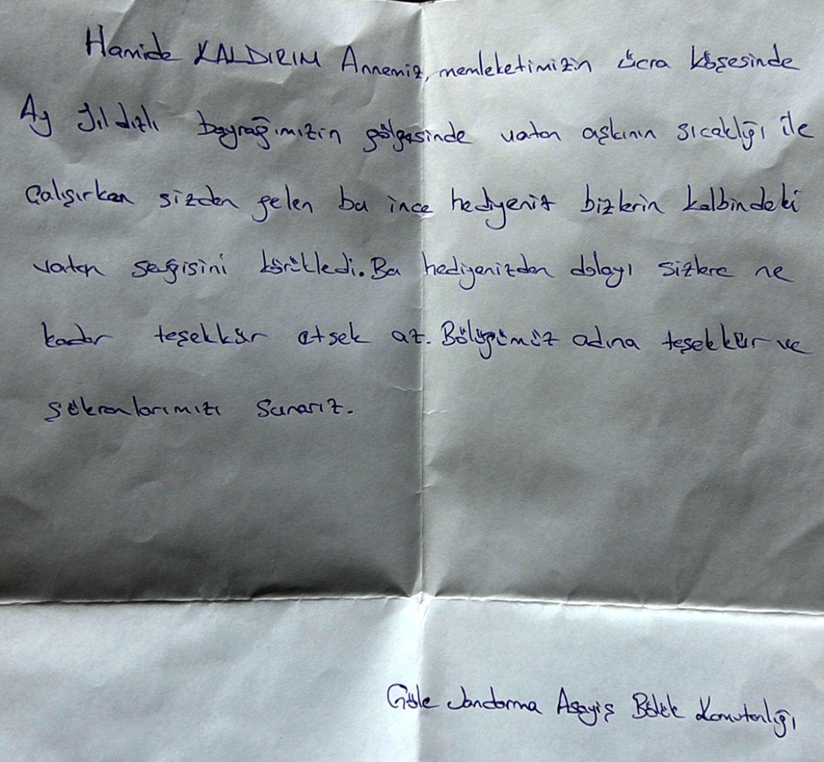 Askerlerden gelen duygu dolu notta “Hamide annemiz. Memleketimizin ücra köşesinde ay yıldızlı bayrağımızın gölgesinde vatan aşkının sıcaklığı ile çalışırken sizden gelen bu ince hediye bizlerin kalbindeki vatan sevgisini körükledi.