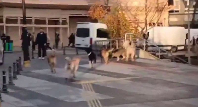 Görüntülerde kaldırımı işgal eden başıboş köpek sürüsü nedeniyle vatandaşların yolun kenarından ilerlediği, zaman zaman köpekler nedeniyle yönlerini değiştirmek zorunda kaldıkları görülüyor.
