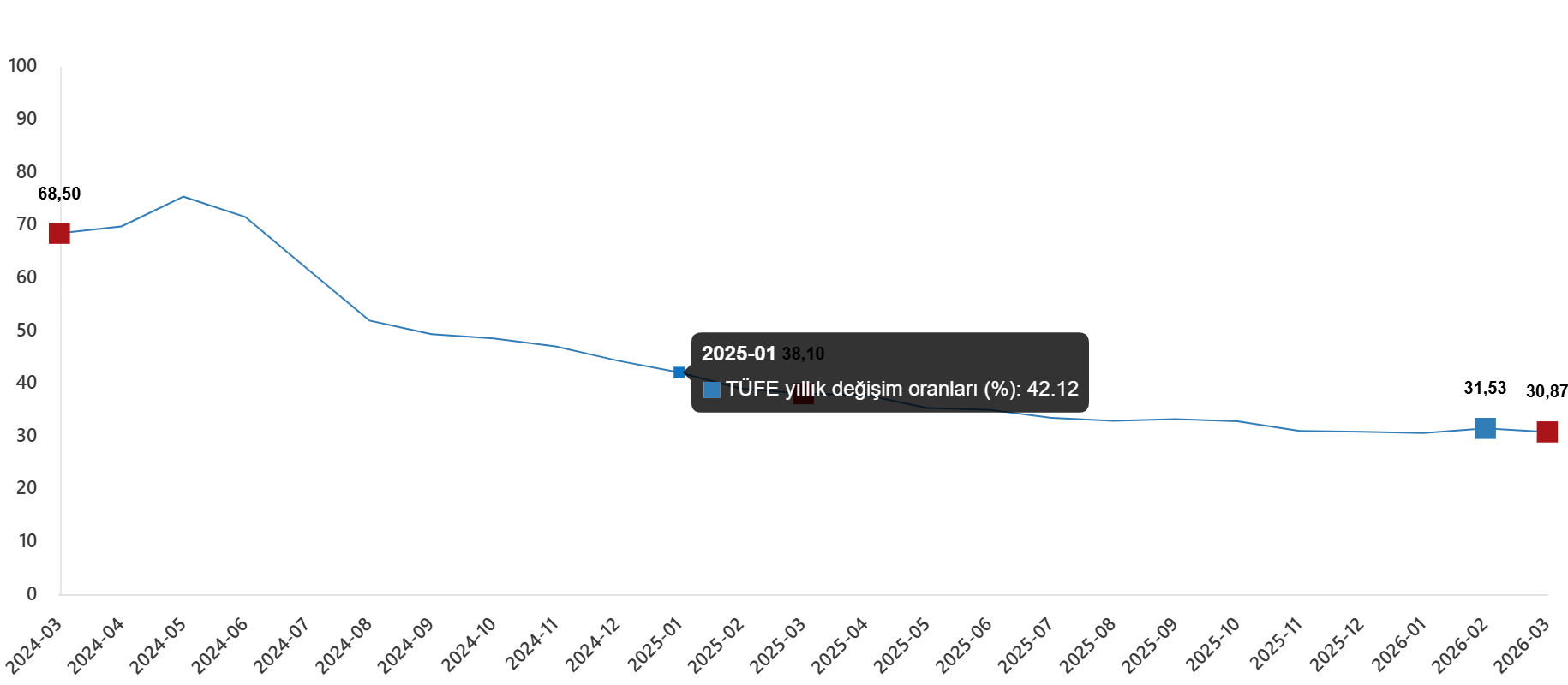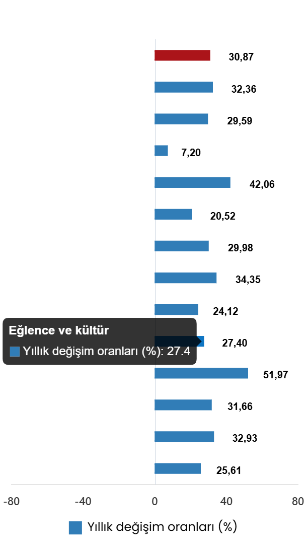 | Bir önceki yılın aynı ayına göre değişim oranı | 30,87 | 38,10 | 68,50 |