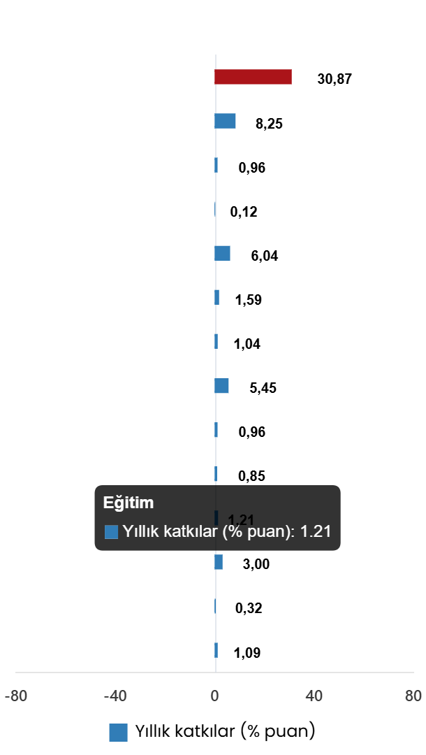 En yüksek ağırlığa sahip üç ana harcama grubunun yıllık değişimleri; gıda ve alkolsüz içeceklerde %32,36 artış, ulaştırmada %34,35 artış ve konut, su, elektrik, gaz ve diğer yakıtlarda %42,06 artış olarak gerçekleşti. İlgili ana harcama gruplarının yıllık değişime olan katkıları ise gıda ve alkolsüz içeceklerde 8,25, ulaştırmada 5,45 ve konut, su, elektrik, gaz ve diğer yakıtlarda 6,04 yüzde puan oldu.