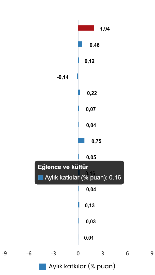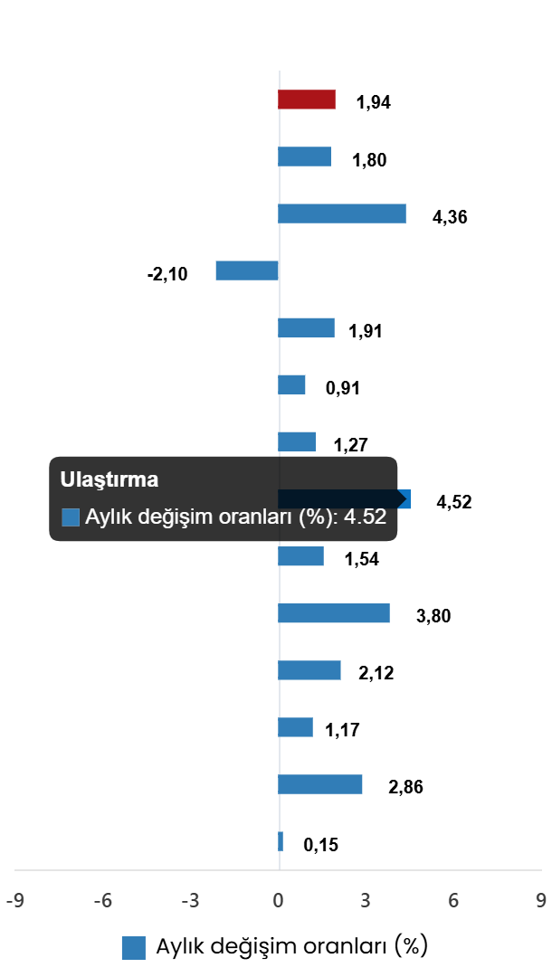 En yüksek ağırlığa sahip üç ana harcama grubunun aylık değişimleri; gıda ve alkolsüz içeceklerde %1,80 artış, ulaştırmada %4,52 artış ve konut, su, elektrik, gaz ve diğer yakıtlarda %1,91 artış olarak gerçekleşti. İlgili ana grupların aylık değişime olan katkıları ise gıda ve alkolsüz içeceklerde 0,46, ulaştırmada 0,75 ve konutta 0,22 yüzde puan oldu. (Ana harcama gruplarına göre endeksler, ağırlıklar ve değişim oranları Ek Tablo-1’de, ana harcama gruplarının genel endeksteki aylık ve yıllık değişime olan katkıları Ek Tablo-3’tedir).