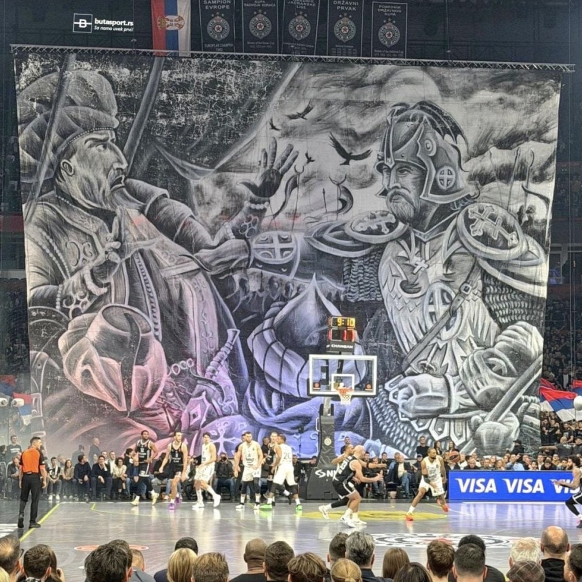 Fenerbahçe’nin Partizan deplasmanında oynadığı maçta Sırp taraftarlar, 1389’daki I. Kosova Savaşı’nda Osmanlı Padişahı I. Murad’ı hançerleyerek şehit eden Milos Obiliç’i tasvir eden bir pankart açmıştı.