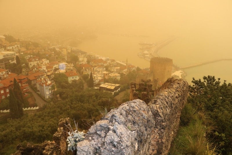 Alanya’da sabah saatlerinde çöl tozunun etkisiyle gökyüzünün rengi değişti. İlçede yağmur da etkili olunca çöl tozu çamura dönüştü.