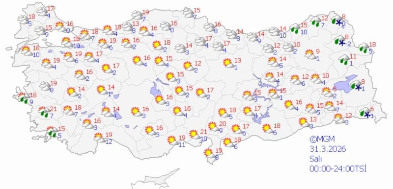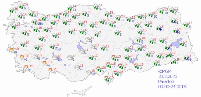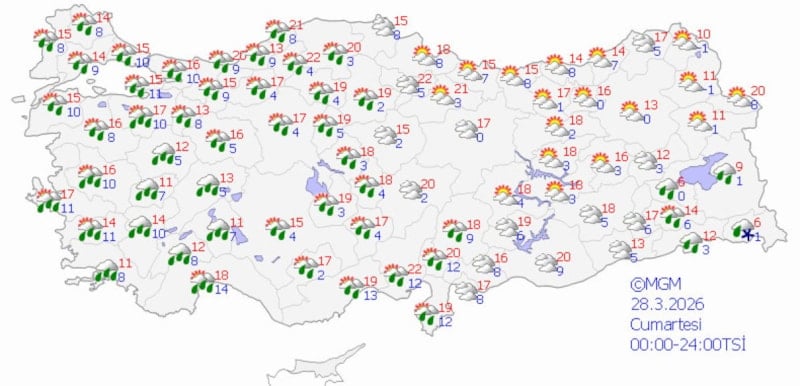 Hafta sonu Marmara, Ege, Akdeniz, İç Anadolu’nun güney ve batısı, Batı Karadeniz (Sinop hariç) ile Nevşehir, Çorum, Şırnak, Bitlis ve Siirt çevrelerinin yağmur ve sağanak; Van ve Hakkari çevrelerinin karla karışık yağmur ve yer yer kar yağışlı geçeceği tahmin ediliyor.