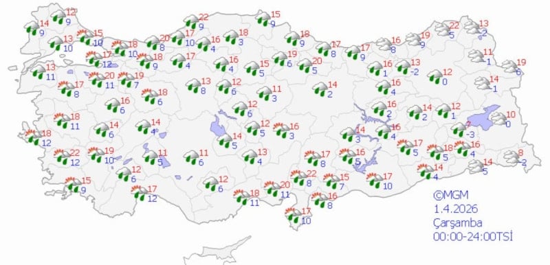 Hafta sonu Marmara, Ege, Akdeniz, İç Anadolu’nun güney ve batısı, Batı Karadeniz (Sinop hariç) ile Nevşehir, Çorum, Şırnak, Bitlis ve Siirt çevrelerinin yağmur ve sağanak; Van ve Hakkari çevrelerinin karla karışık yağmur ve yer yer kar yağışlı geçeceği tahmin ediliyor.